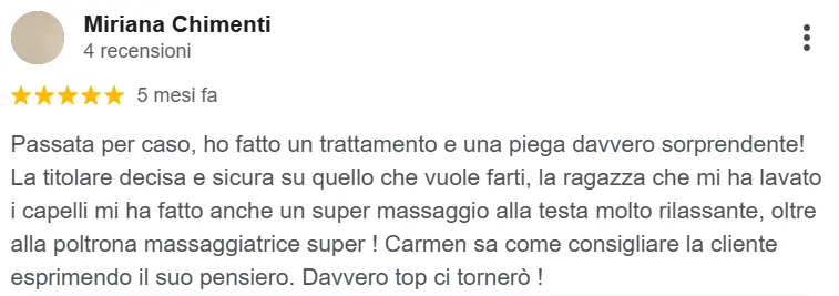 “... ho fatto un trattamento e una piega davvero sorprendente! La ragazza che mi ha lavato i capelli mi ha fatto anche un super massaggio alla testa molto rilassante”